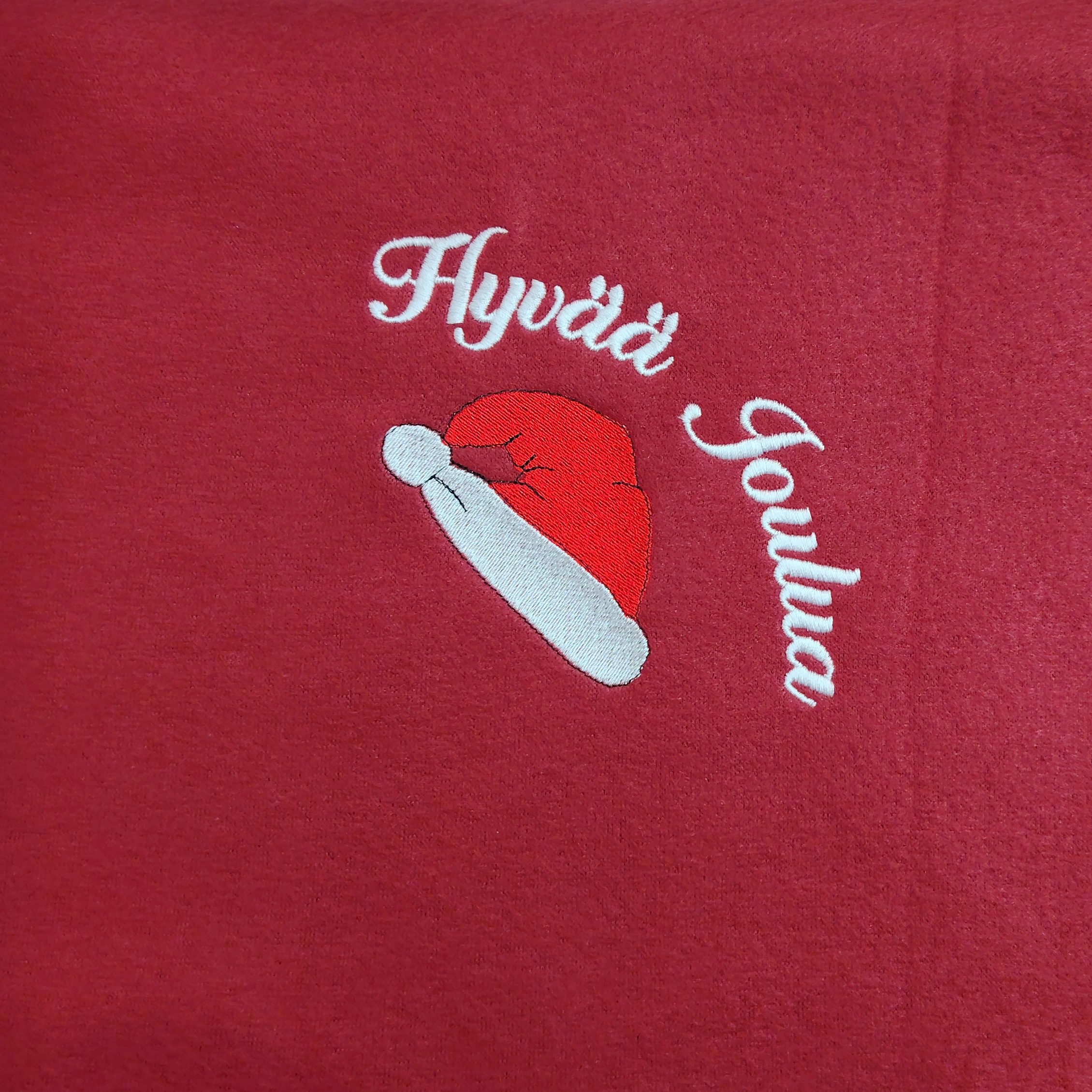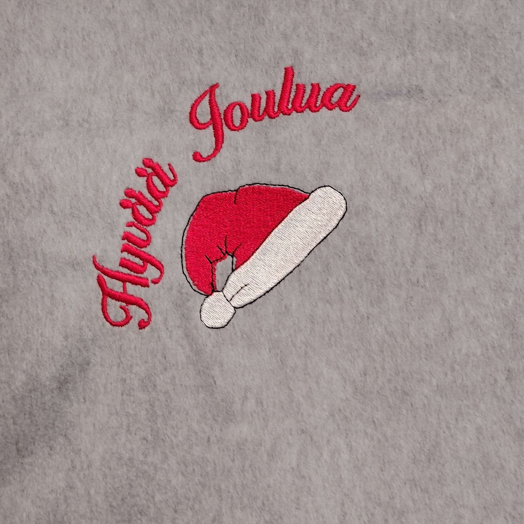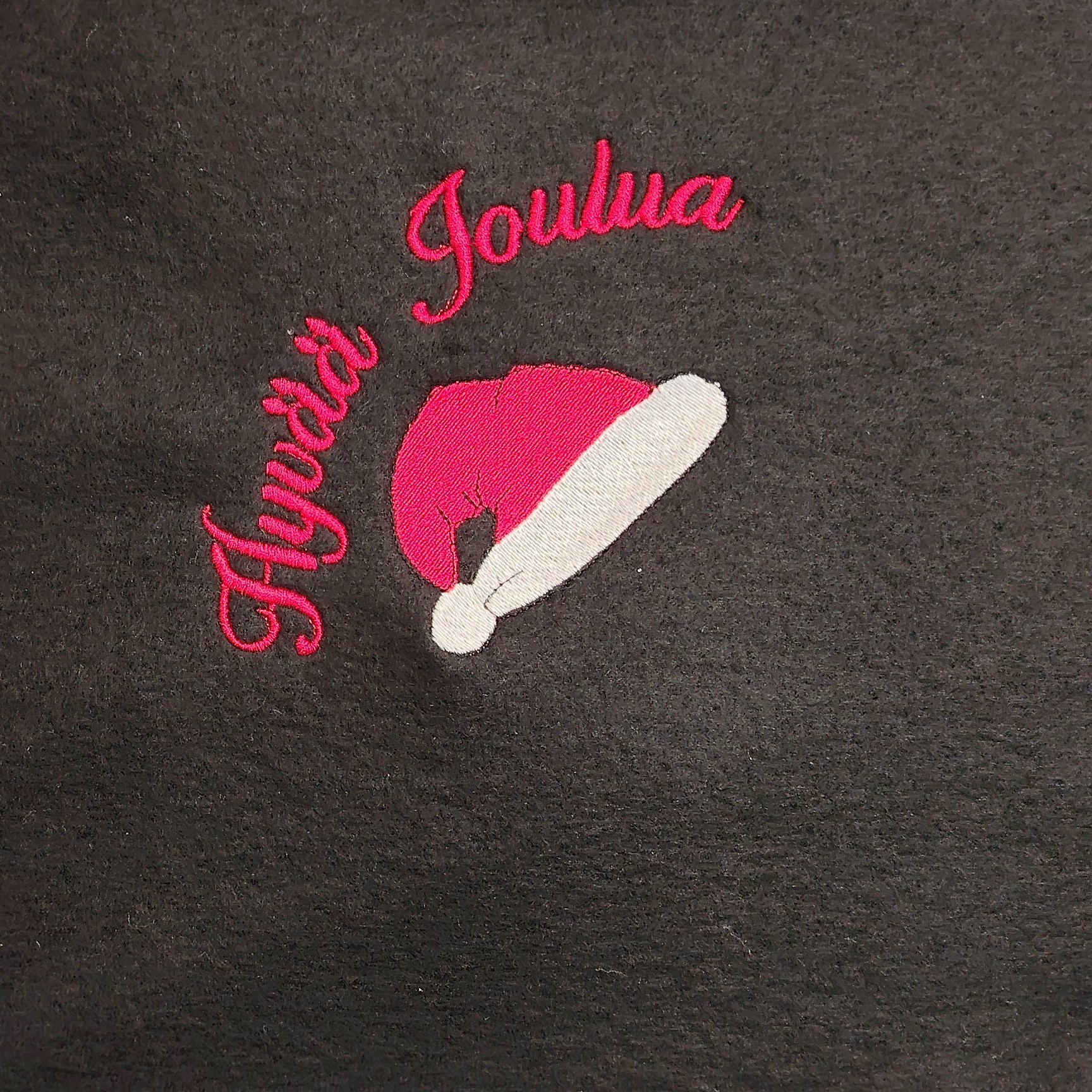 Kuva brodeerattuna peiton kulmaan ja kuvan koko n.11 x 11cm