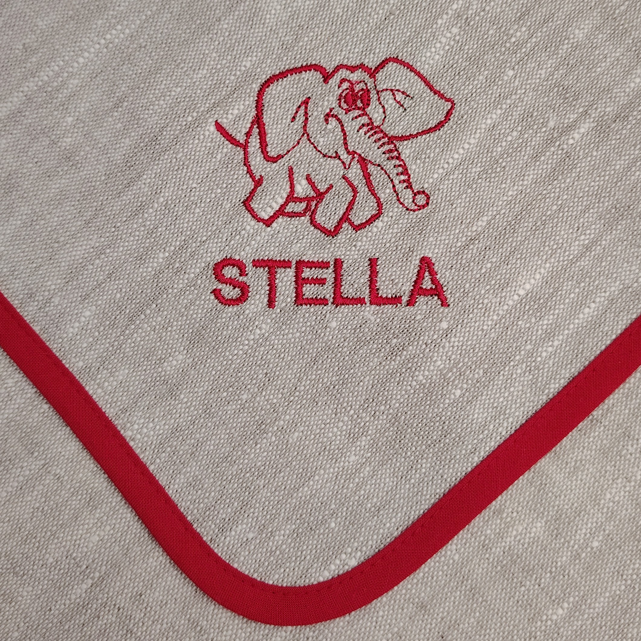 Materiaalina pellava kangas ja puuvilla vinonauha, joka kiertää ympäri muodostaen ripustuslenkin kulmaan.