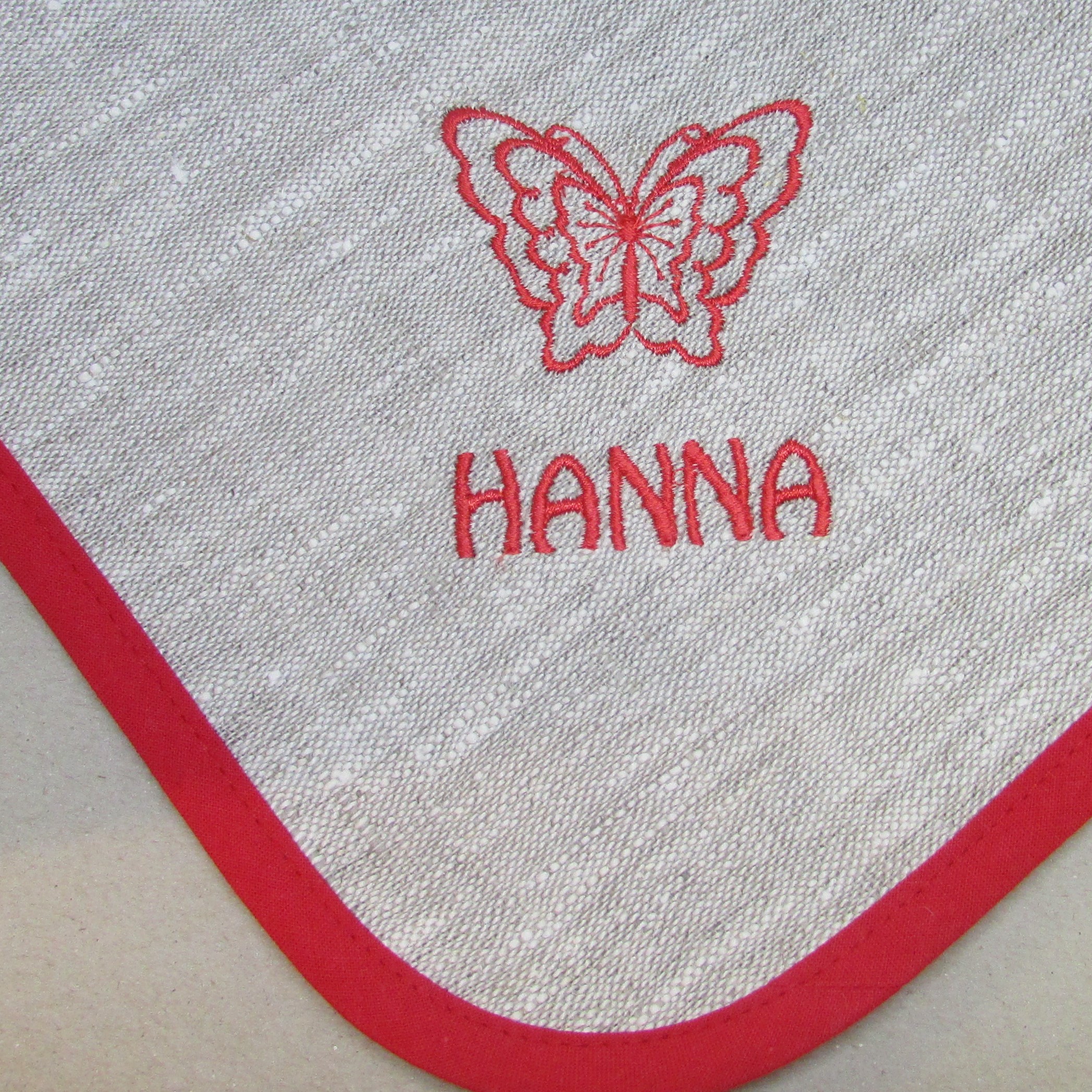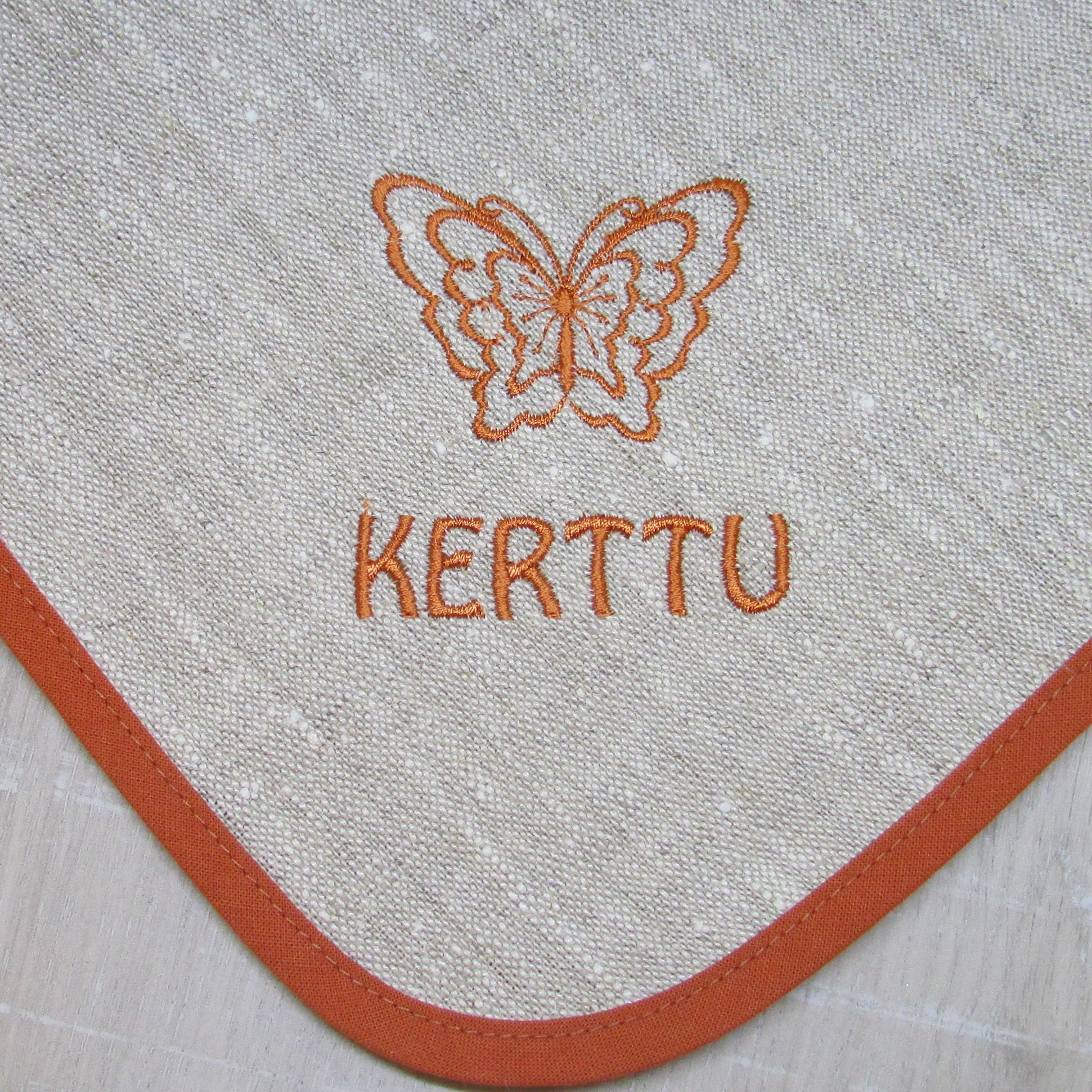 Materiaalina pellava kangas ja puuvilla vinonauha, joka kiertää ympäri muodostaen ripustuslenkin kulmaan.