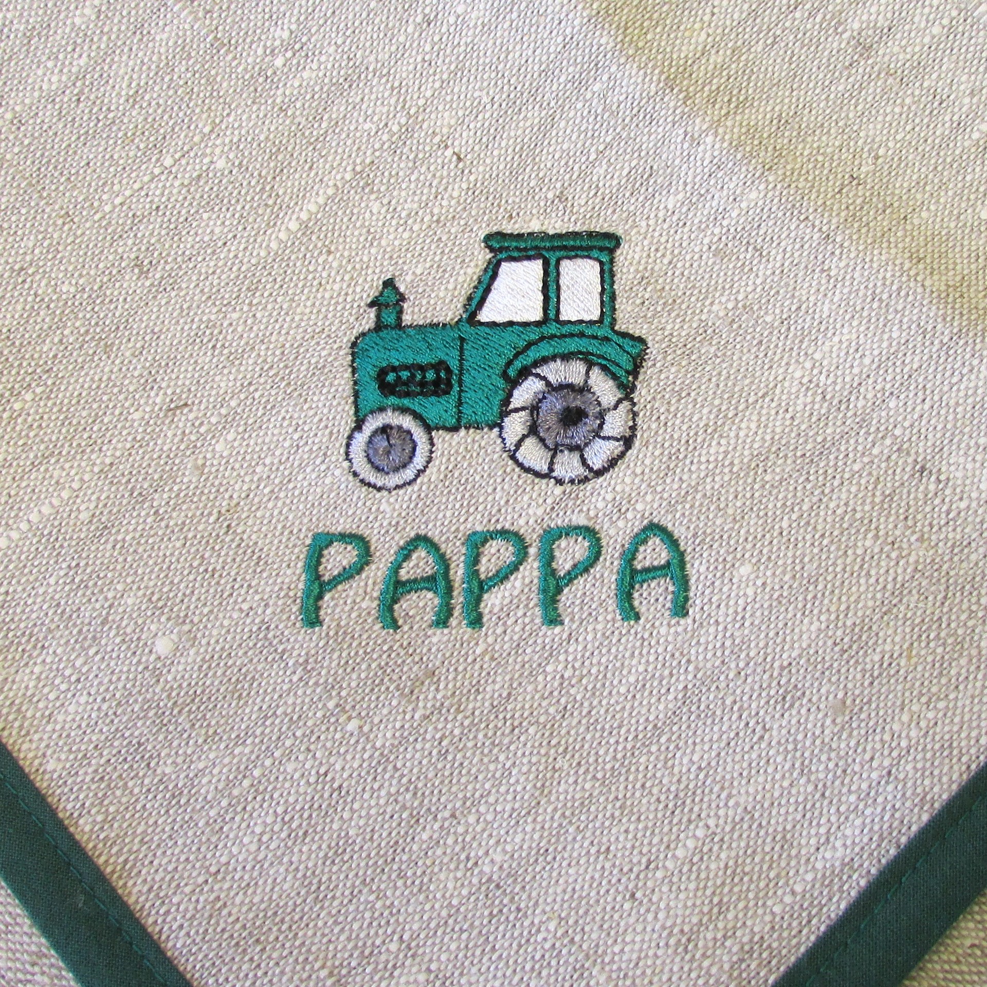 Materiaalina pellava kangas ja puuvilla vinonauha, joka kiertää ympäri muodostaen ripustuslenkin kulmaan.